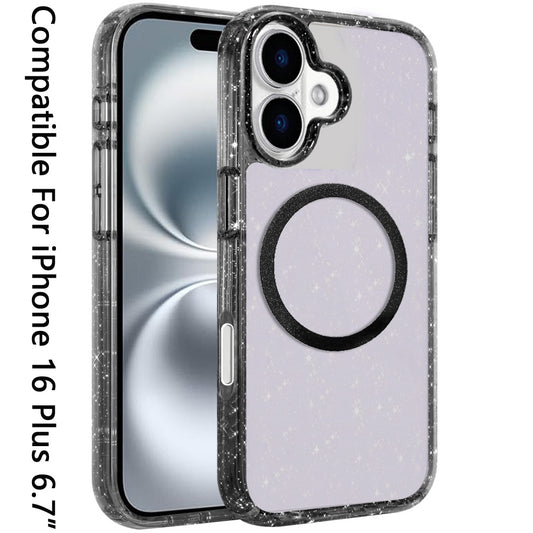 For Apple iPhone 16 Plus (6.7") Transparent Glitter Bling Sparkly Shiny Case Hybrid Magnetic Circle Compatible with MagSafe Shockproof Case Cover