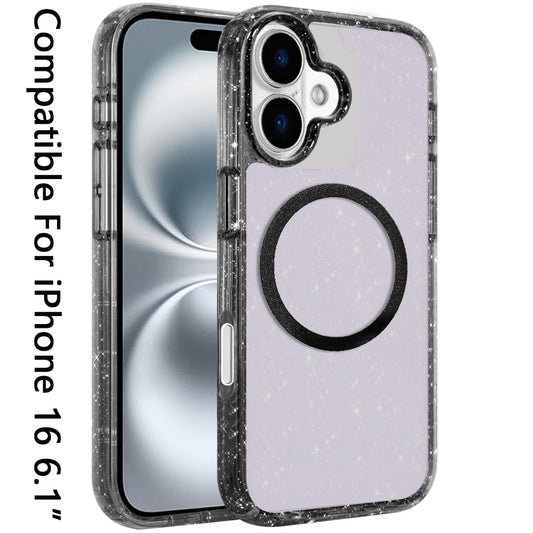 For Apple iPhone 16 (6.1") Transparent Glitter Bling Sparkly Shiny Case Hybrid Magnetic Circle Compatible with MagSafe Shockproof Case Cover
