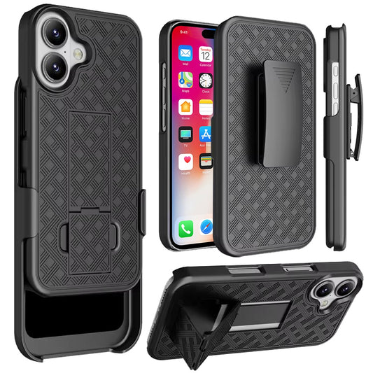 For Apple iPhone 16 (6.1") Premium Hybrid Texture Built-in Kickstand Holster Combo 3in1 Swivel Belt Clip Slim Shockproof Case Cover Black
