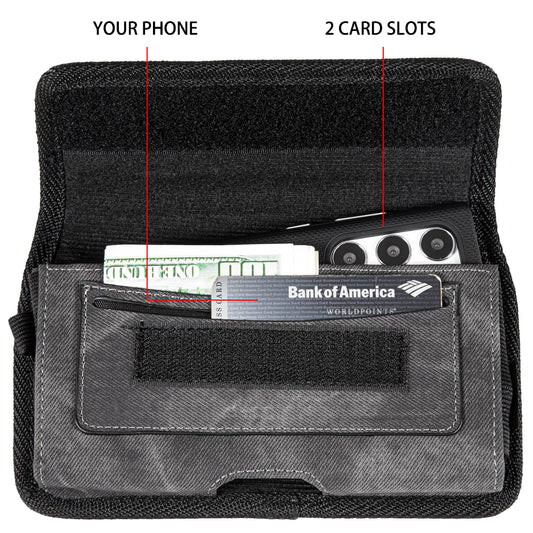 For Motorola Moto G Stylus 5G (2022) Universal Horizontal Cell Phone Case Fabric Holster Carrying Pouch with Belt Clip and 2 Card Slots fit XL Devices 7" [Black Denim]