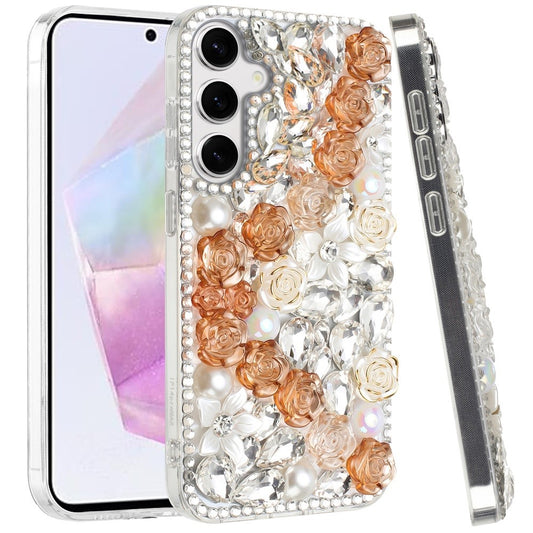 For Samsung Galaxy A36 Fashion Rose Flower Floral Bling Crystal 3D Full Diamonds Pearl Sparkle Rhinestone Glitter Hybrid Case Cover