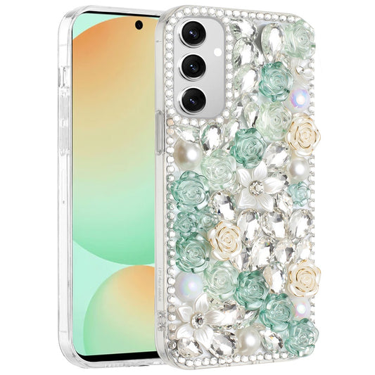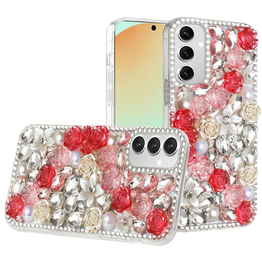 For Samsung Galaxy S24 FE /Fan Edition Fashion Rose Flower Floral Bling Crystal 3D Full Diamonds Pearl Sparkle Rhinestone Glitter Hybrid Case Cover