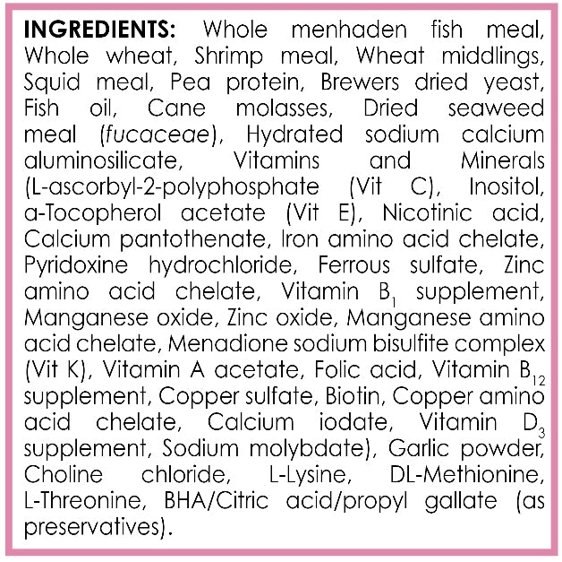 Ingredients: Wheat Flour, Shrimp Meal, Pea Protein, Condensed Fish Protein Digest, Squid Meal, Dried Seaweed Meal (Fucaceae), Beet Powder, Mussel Meal, Brewers Dried Yeast, Fish Oil, Cockles, Earthworm Meal, Dried Tomato Pomace, Garlic Powder, Polychaete Worms, Dried Waterflies, Lecithin, Choline Chloride, Tagetes Extract, Honey, Hydrolyzed Yeast, Calcium, L-Ascorbyl-2-Monophosphate, A-Tocopherol Acetate, Inositol, Propyl Gallate (preservative), Citric Acid (preservative), Calcium Pantothenate, Riboflavin, BHT (preservative), Thiamine Mononitrate, Vitamin A Acetate, Folic Acid, Copper Sulfate, Biotin and Vitamin D3 Supplement.