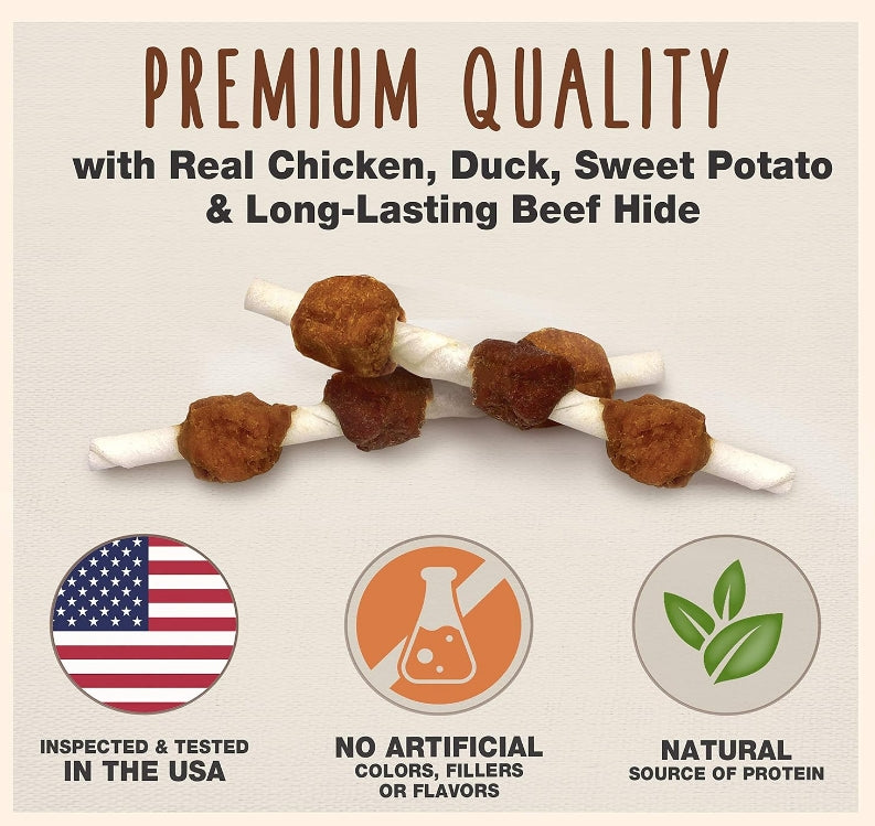 IngredientsBeef Hide, Chicken, Duck, Sweet Potato, Wheat Flour, Vegetable Glycerin, Vegetable Protein, Garlic Powder, Potassium Sorbate (Preservative).