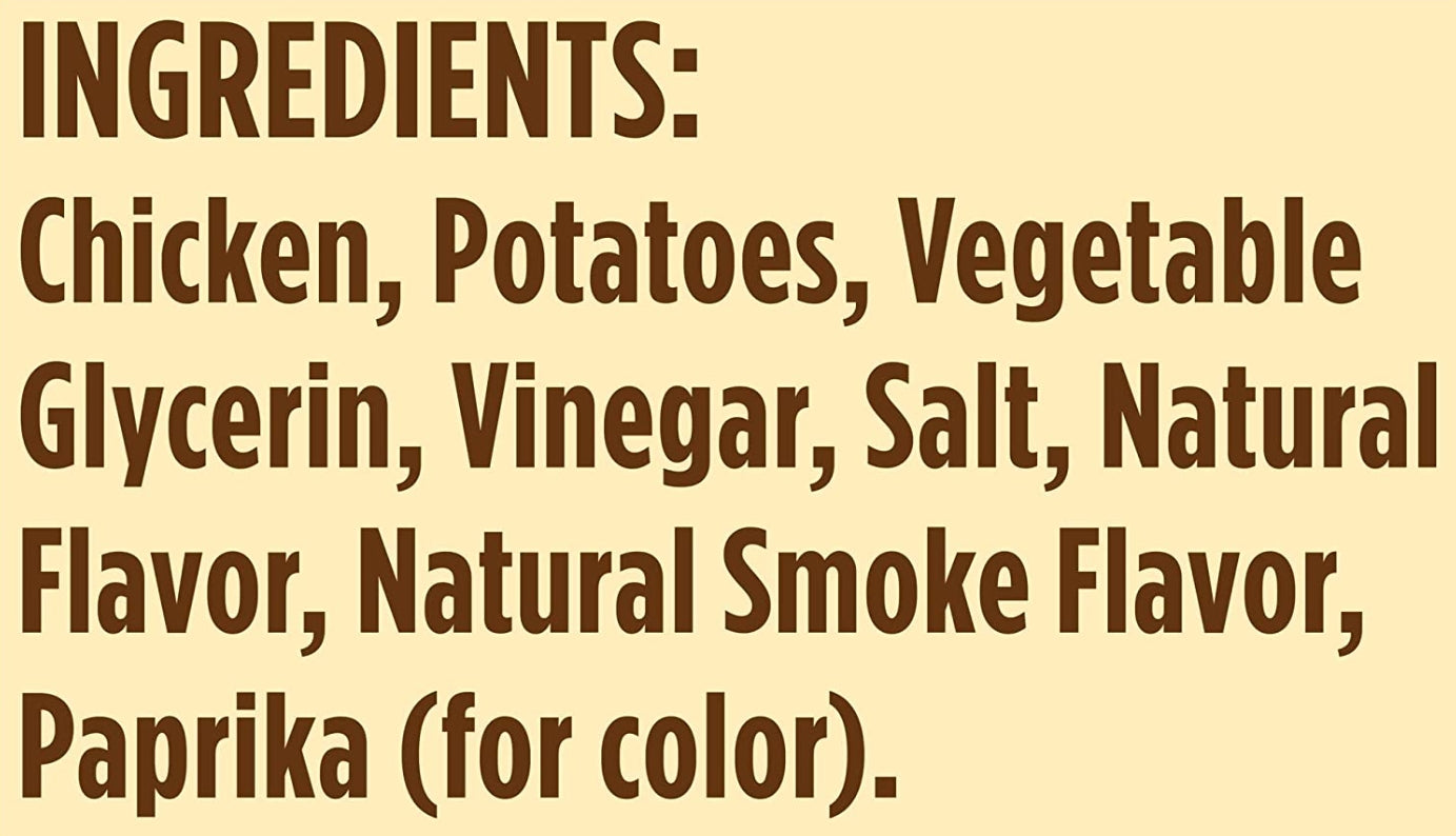 Ingredients: Chicken, Vegetable Glycerin, Natural Flavors, Distilled Vinegar, Salt, Natural Smoke Flavor, Colored with Paprika.