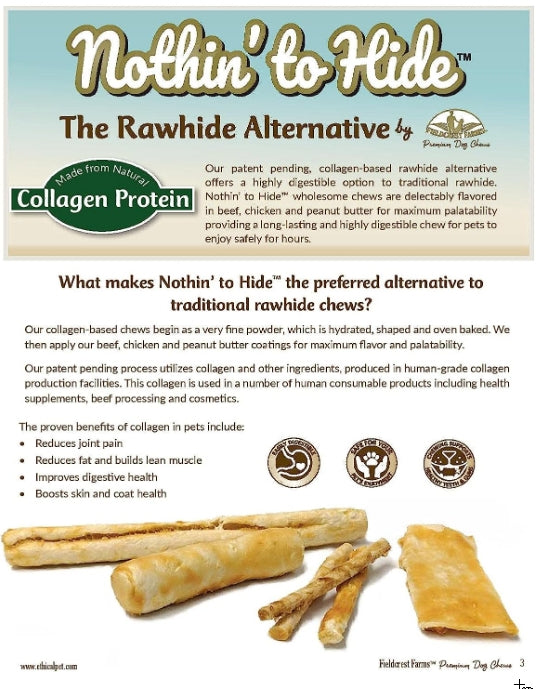 Nothin to Hide chews are highly digestible, collagen based chews for dogs. Available in a wide range of sizes and shapes, our wholesome chicken coated chews are sure to offer a safe, flavorful chewing experience for your pets.
