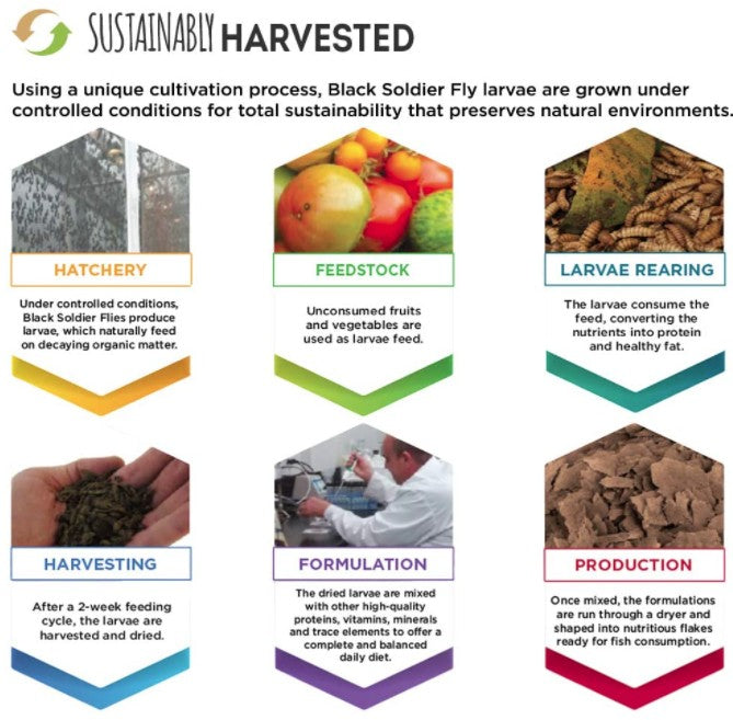 Ingredients: Spirulina, Mealworm meal, Dried black soldier fly larvae, Wheat, Potatoes, Fish protein concentrate, Brewers dried yeast, Krill, Shrimp meal, Dehydrated alfalfa meal, Dried kelp, Cauliflower, Spinach, Garlic, Salmon oil, Carrot, Calcium L-ascorbyl-2-monophosphate (source of vitamin C), Vitamin E supplement, Vitamin A supplement, Inositol, Niacin, d-Calcium pantothenate, Riboflavin, Pyridoxine hydrochloride, Folic Acid, Thiamine mononitrate, Biotin, Vitamin B12 supplement, Vitamin D3 supplement.