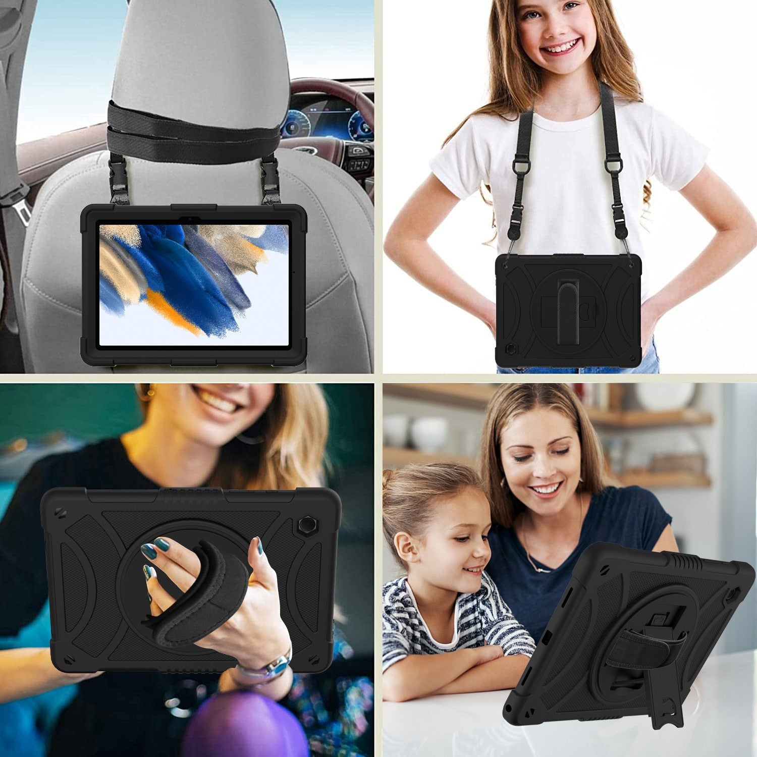 Black Upgrade your tablet protection with this 3-in-1 tough hybrid case, designed for durability and convenience. Featuring a 360° rotating kickstand for hands-free viewing, an adjustable hand strap for a secure grip, and a detachable shoulder strap for easy carrying, this case is perfect for work, school, or travel. The shock-absorbing hybrid design provides maximum protection from drops and impacts, while precise cutouts ensure full access to all functions. Whether for students, professionals, or outdoor users, this case delivers functionality and rugged protection.