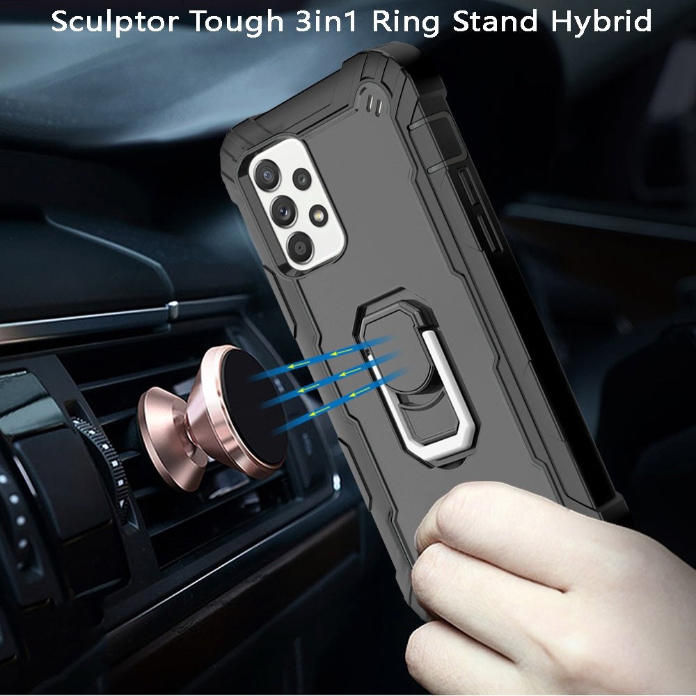 Premium Tuff Hybrid Tough 3in1 Ring Stand Holster Hybrid Case Frame Bumper Soft TPU Silicone Drop Protective Hard PC Cover [Support Magnetic Car Mount]