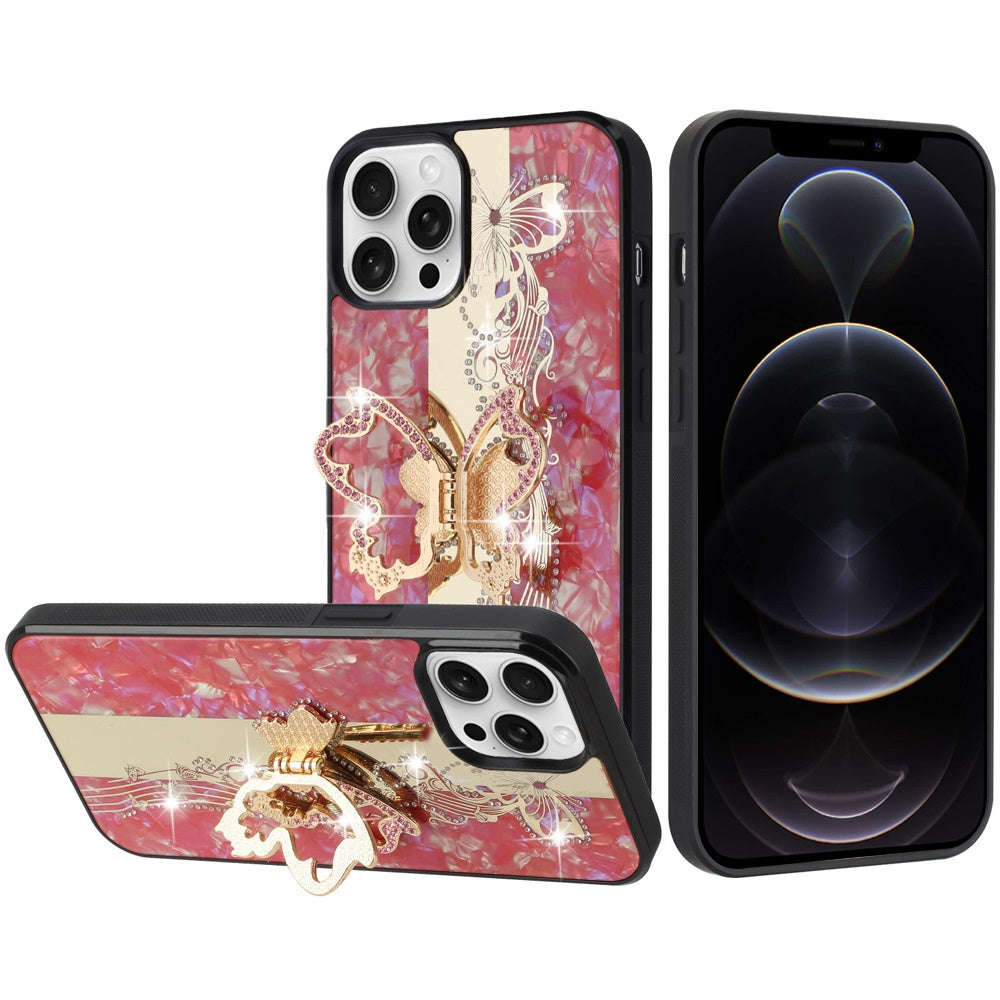 For Apple iPhone 12 Pro Max Diamond Bling Sparkly 3D Ornaments Engraving Hybrid with Ring Stand Fashion Case Cover Enchanted Butterfly Red