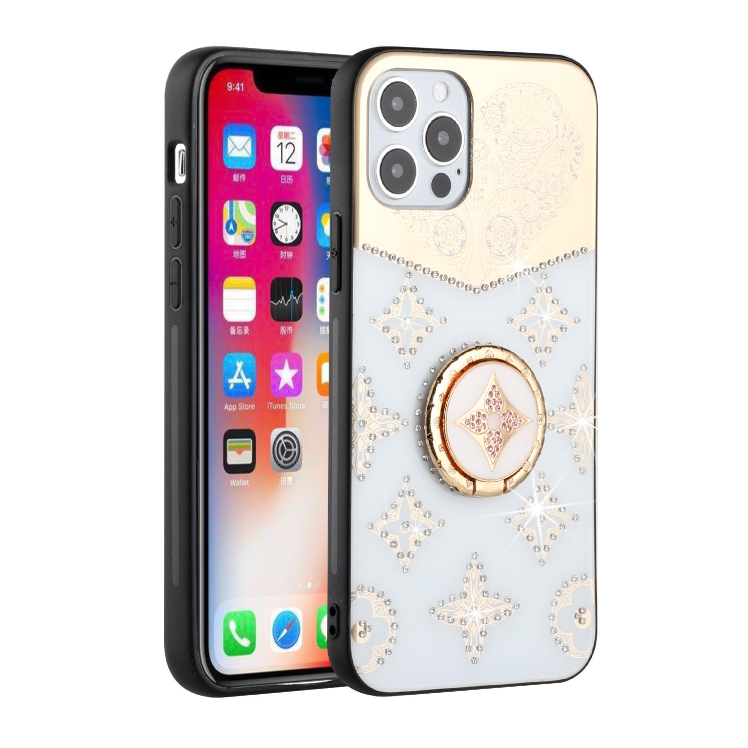 For Apple iPhone 13 Pro (6.1") Diamond Bling Sparkly Glitter Ornaments Engraving Hybrid Armor with Ring Stand Holder Rugged Fashion Phone Case Cover