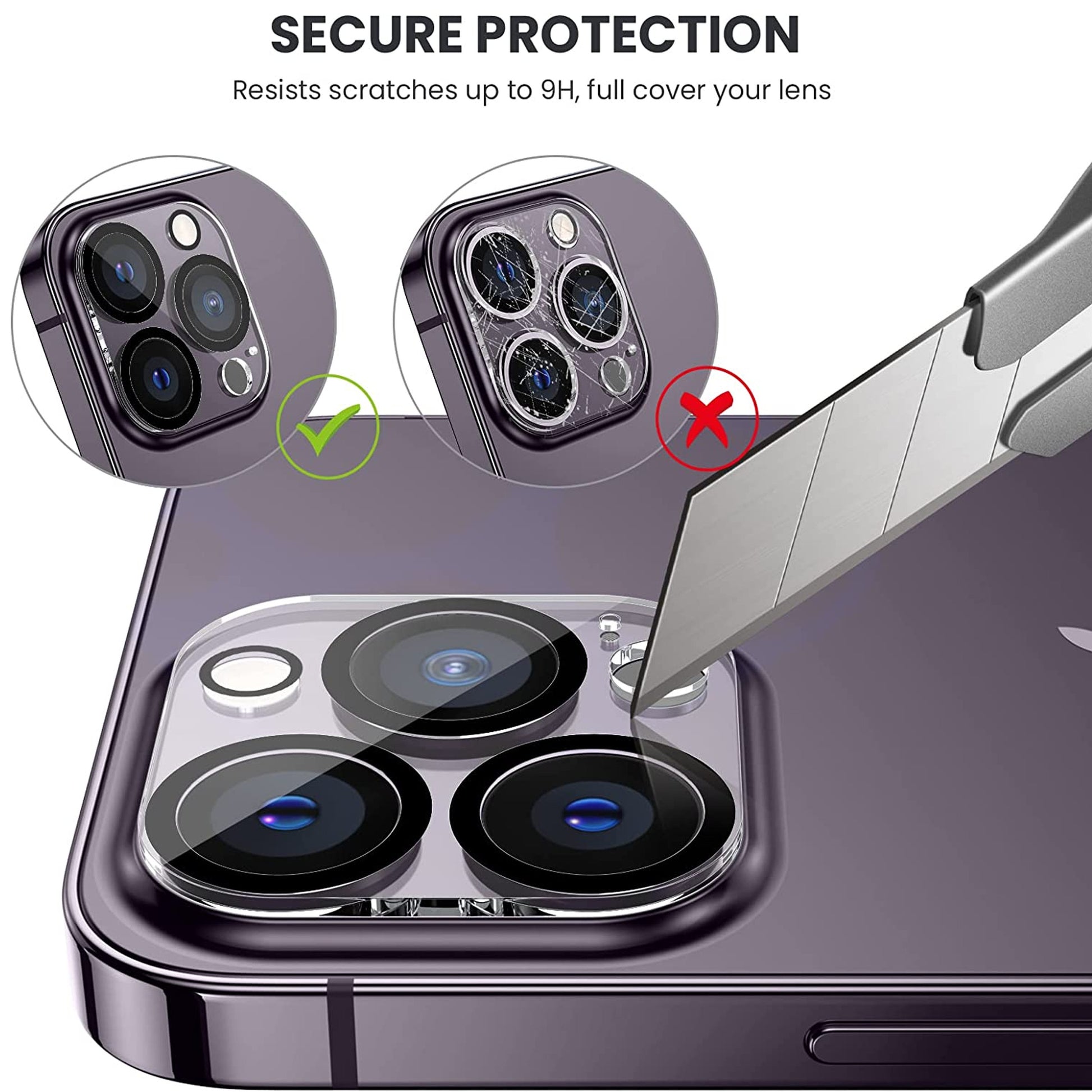• 9H Hardness for Scratch Resistant: the lens protector is made of 9H Hardness Tempered Glass, avoid effectively the damages from scratch and drop.