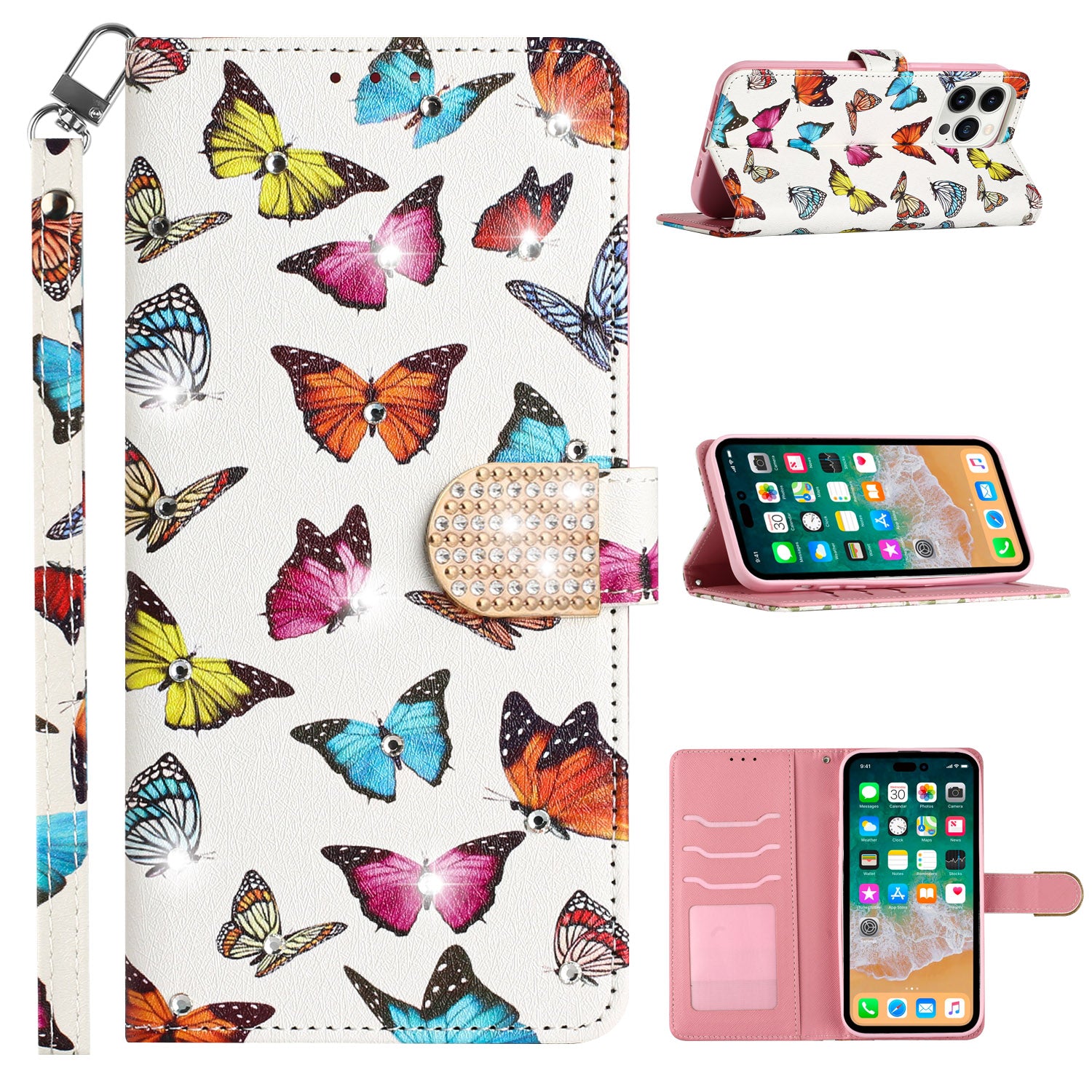 Luxury Fashion Glitter Bling Diamonds Cover 3D Design PU Leather Flip Wallet Case with Magnetic Closure Buckle, Strap, Stand and ID Card Slot Cover
