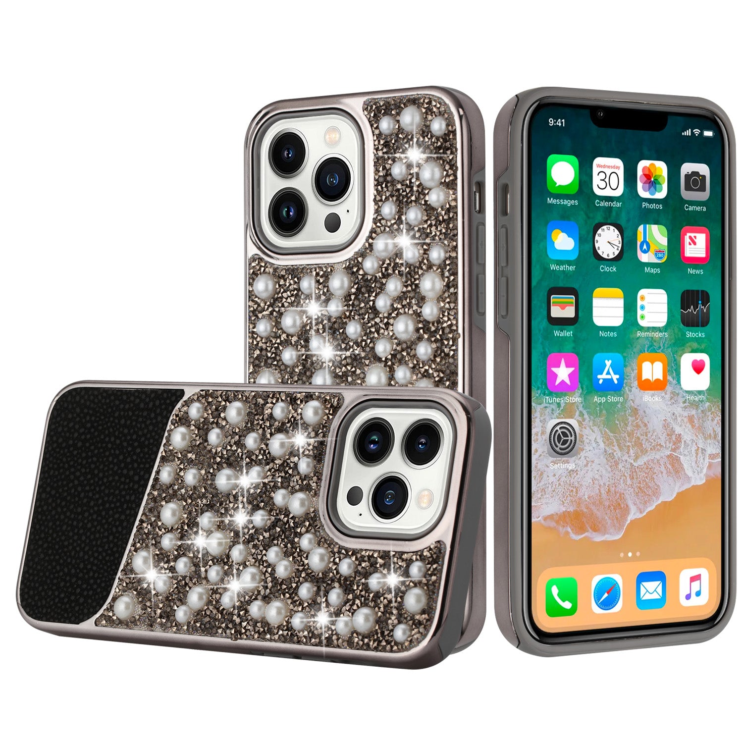For Apple iPhone 14 (6.1") Bling Pearl Diamonds Design Glitter Hybrid Thick Hard TPU Shiny Protective Rubber Frame Phone Case Cover