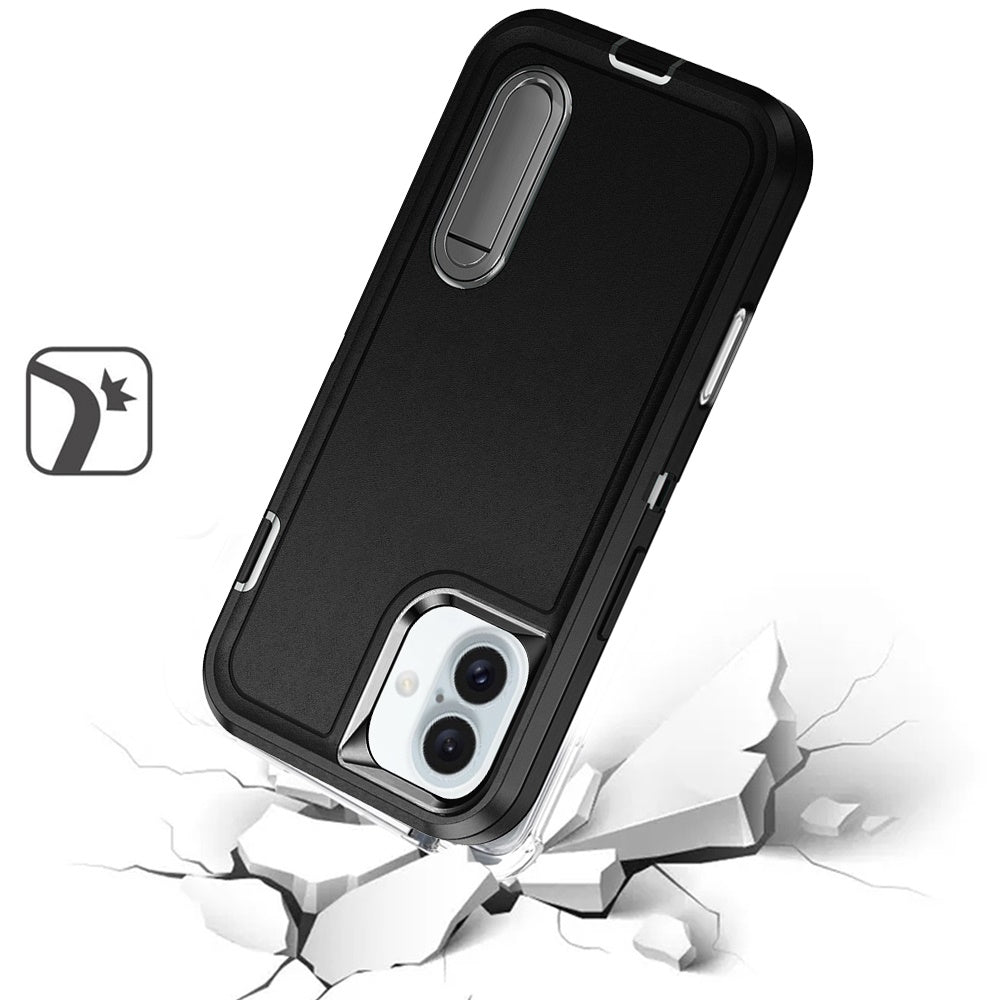 For Apple iPhone 16 (6.1") Hybrid 3 Layers Hard 3in1 Shockproof with Kickstand Heavy Duty Hard TPU Rubber Anti-Drop Case Cover Black