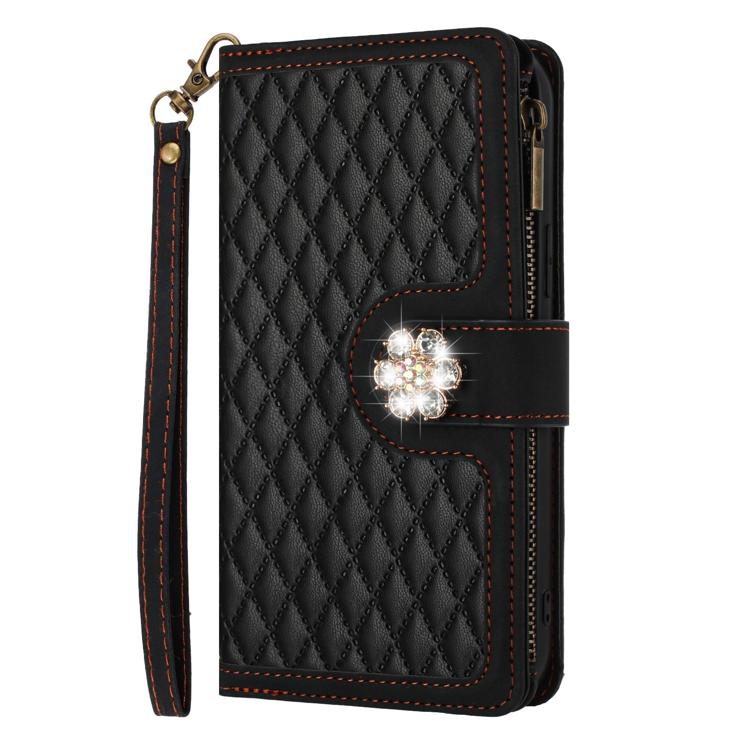 For Apple iPhone 16 (6.1") PU Leather Wallet Design Jewel Bling with Credit Card Holder Flip Folio Pouch Zipper Purse Wrist Strap Case Cover