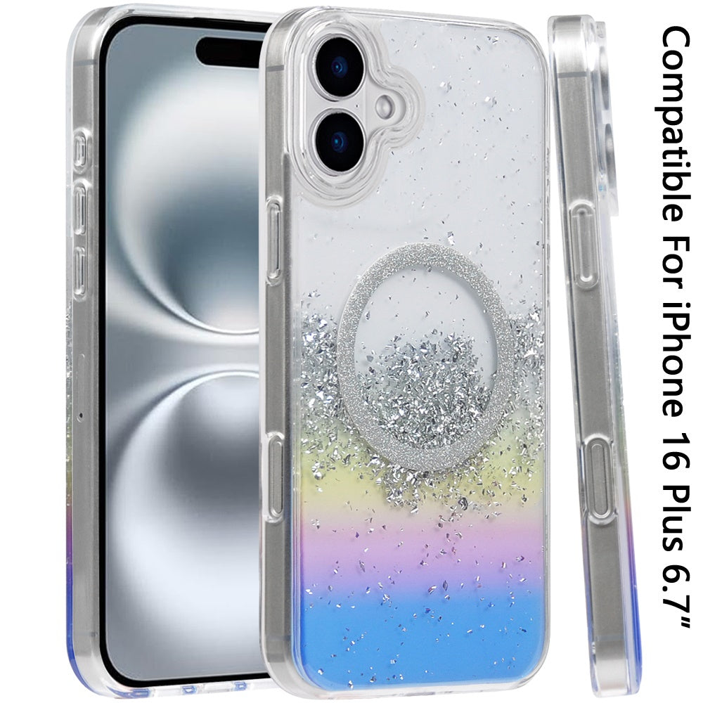 For Apple iPhone 16 Plus (6.7") Transparent Epoxy Glitter Magnetic Circle Compatible with MagSafe Hybrid Bling Sparkle Hard PC Slim TPU Case Cover