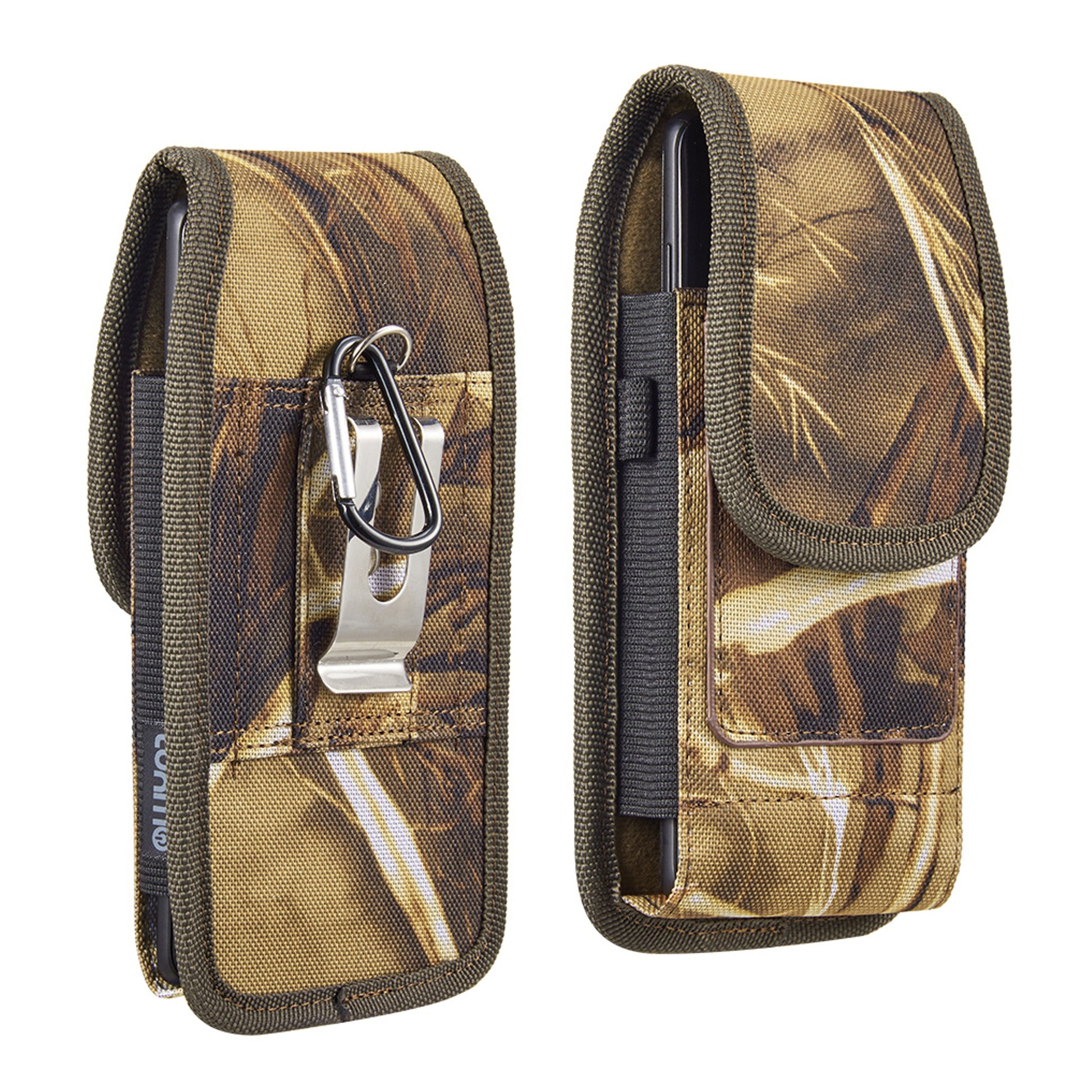 Camouflage Universal Vertical Pouch Case Phone Holder with Belt Clip, Built in 2 Credit Card Slots, Pen Holder Pocket and Carabiner Hook Carrying on Pouch Cover Fit Extra Large Phone Device