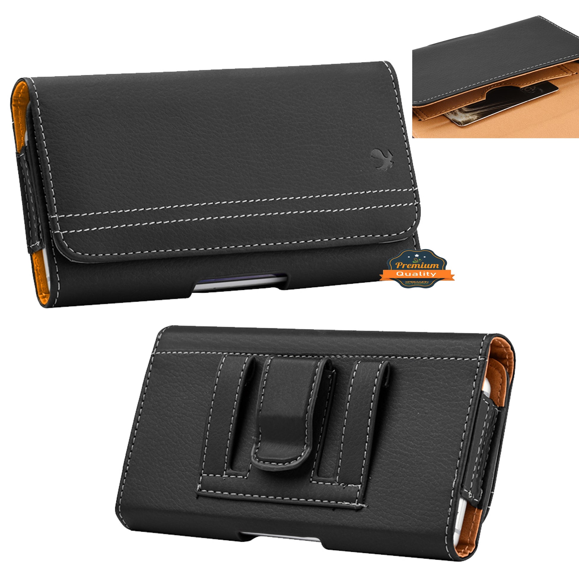 • Safely carry your phone with this Horizontal Carry Case. Premium leatherette and high-quality construction with black color stitching and sealed seams for durability and classic good looks.