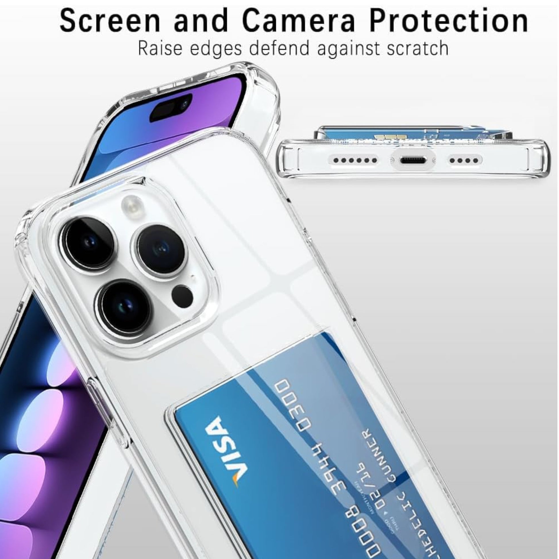 Clear Phone Case Cover For Apple iPhone 17 Pro Max (6.9") Protect your phone in style with this Acrylic TPU Clear Case featuring 2 built-in credit card slots. Crafted from durable yet slim materials, it offers reliable protection against daily wear, scratches, and drops, while the transparent back highlights your phone's original design. The integrated card holder adds convenience by letting you carry your ID or essential cards without the need for a wallet. With raised edges for added screen and camera safety, precise cutouts, and a comfortable grip, this case is both practical and stylish-perfect for everyday use.