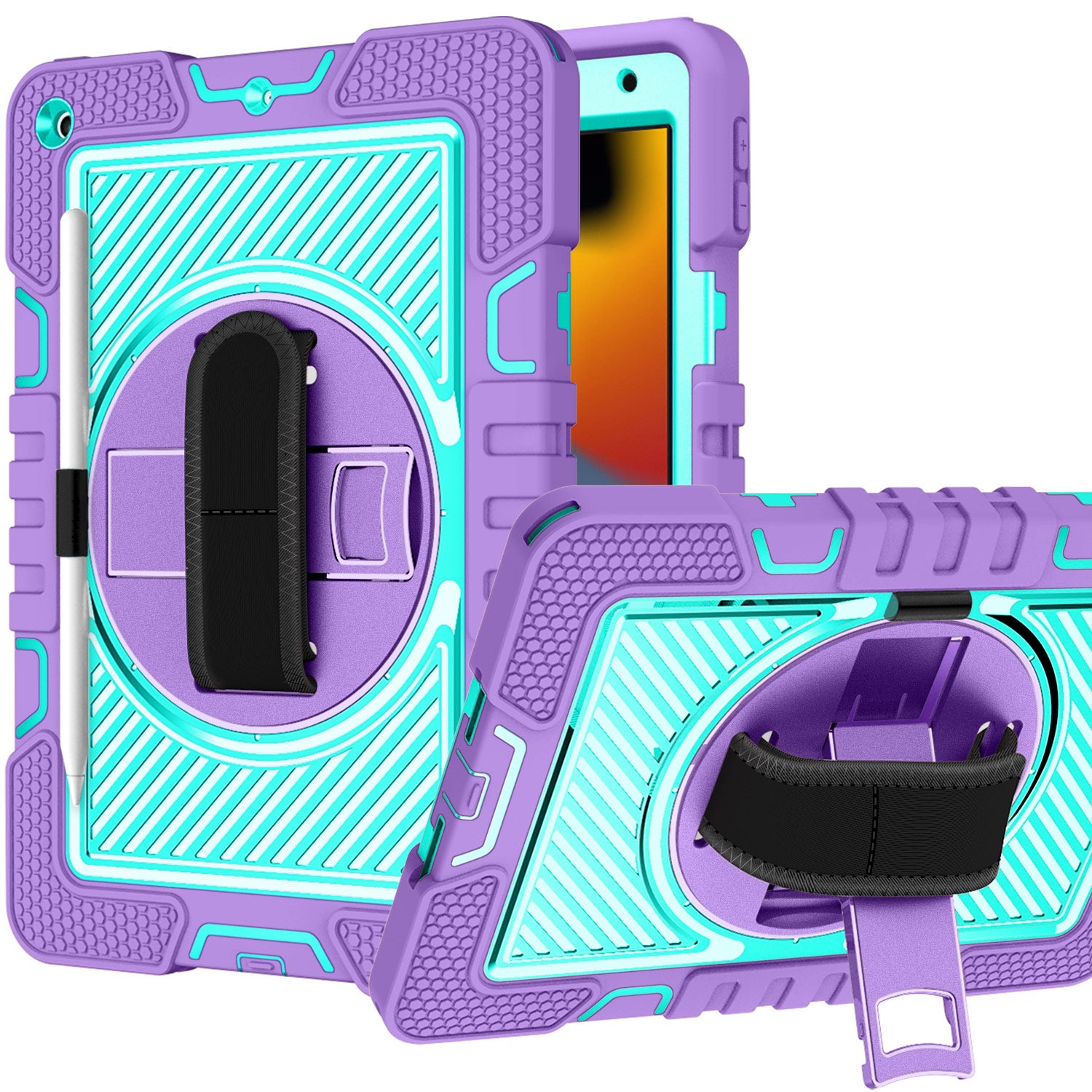 For Hybrid 3in1 Multi-Functional Shockproof Tablet Case with Hand, Shoulder Strap, Pencil & Stand Holder Purple Teal Tablet Case Cover