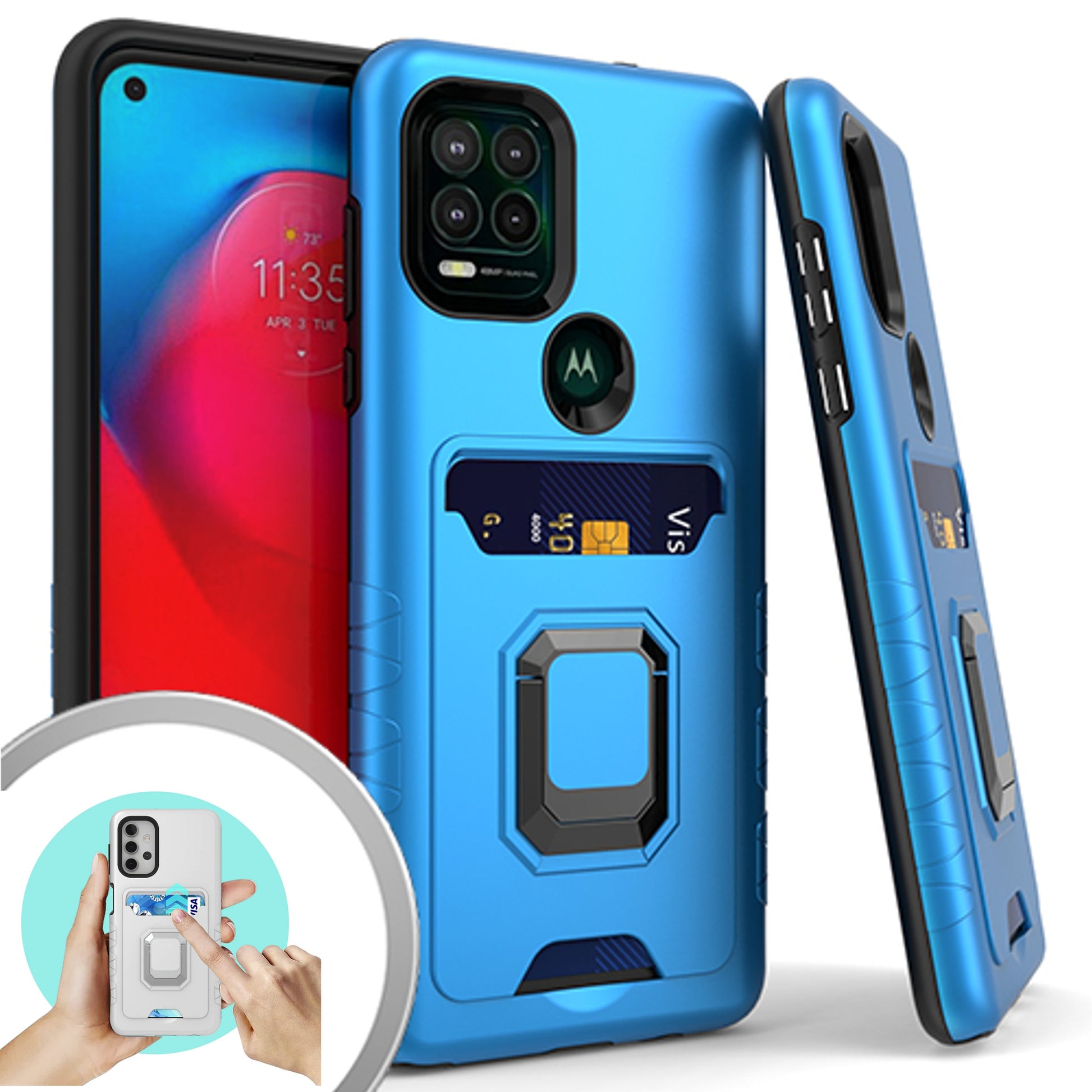 For Motorola Edge+ 2022 /Edge Plus Wallet Credit Card Slot with Ring Kickstand Heavy Duty Shockproof Hybrid Magnetic Stand Blue Phone Case Cover