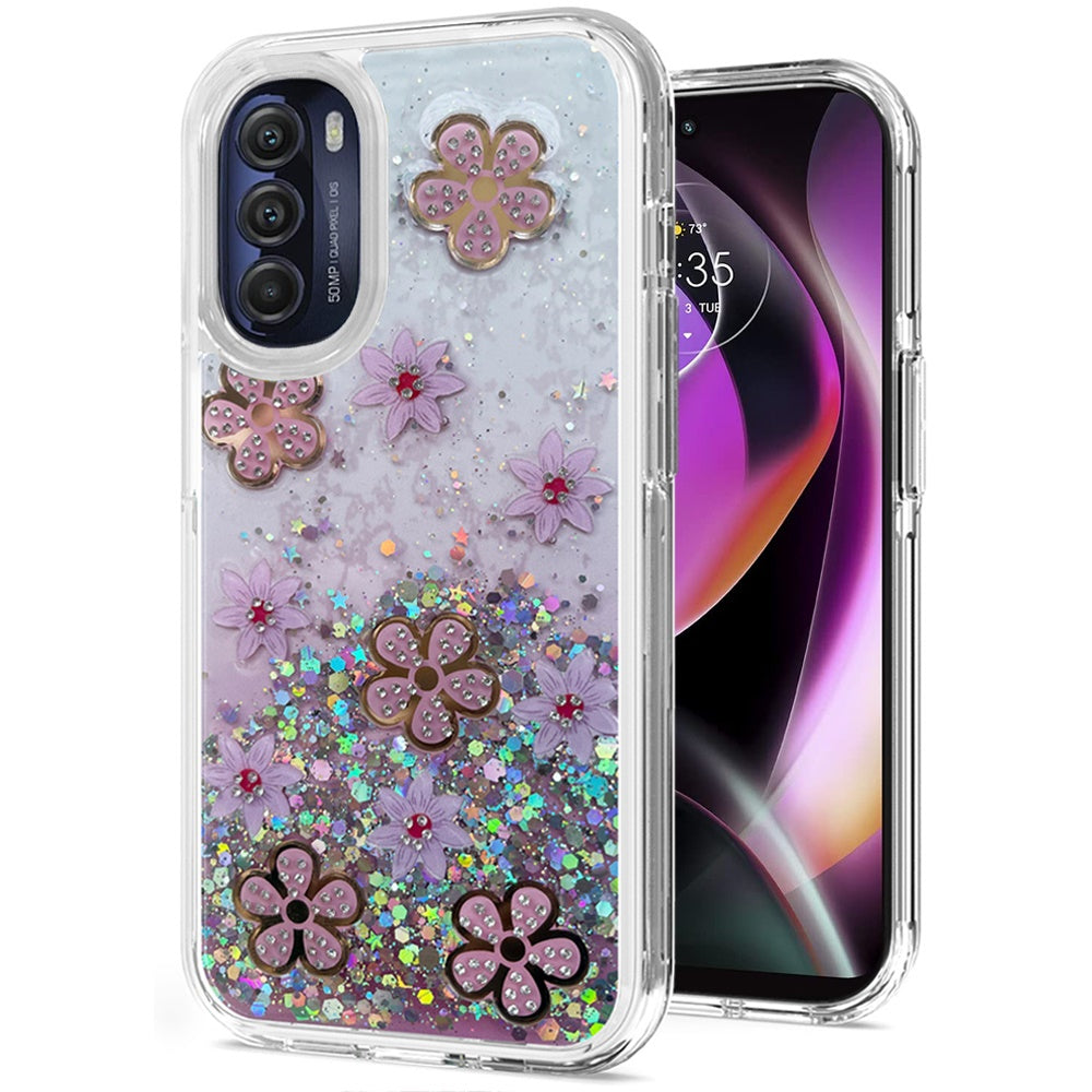 For Motorola Moto G 5G 2022 Floral Stylish Design Glitter Shiny Hybrid Rubber TPU Hard PC Shockproof Armor Slim Fit Phone Case Cover