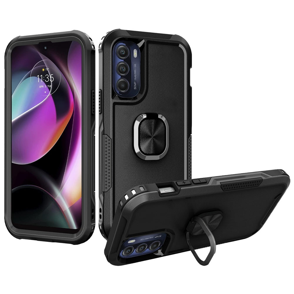 For Motorola Moto G 5G 2022 Heavy Duty 3in1 Magnetic Ring Kickstand Hybrid Shockproof Military-Grade Drop Protection Black Phone Case Cover