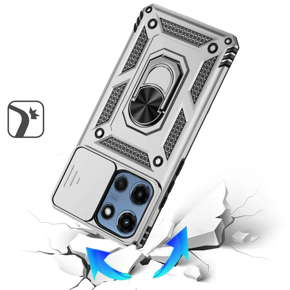 Silver Phone Case Cover For Moto G 5G (2025) Protect your phone with this durable and versatile case featuring a 360° rotating ring kickstand for convenient hands-free use. Designed with camera lens protection and a shockproof soft edge bumper, it ensures all-around protection from drops, scratches, and impacts. The slim and lightweight design maintains your phone's sleek profile while offering a secure grip. With precise cutouts for all buttons, ports, and features, this case combines style, functionality, and durability for everyday use.