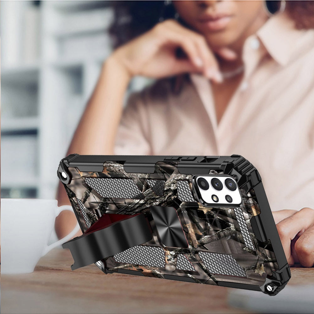 Premium Camouflage Camo Pattern Design Hybrid Machine Magnetic Kickstand Heavy Duty Dual-Layer TPU Hard Shell Military Grade Full-Body Rugged Case Protective Cover with Built-in Bracket Magnetic Metal Plate for Car Mount and Kickstand (Not includes the magnetic car mount holder !!)