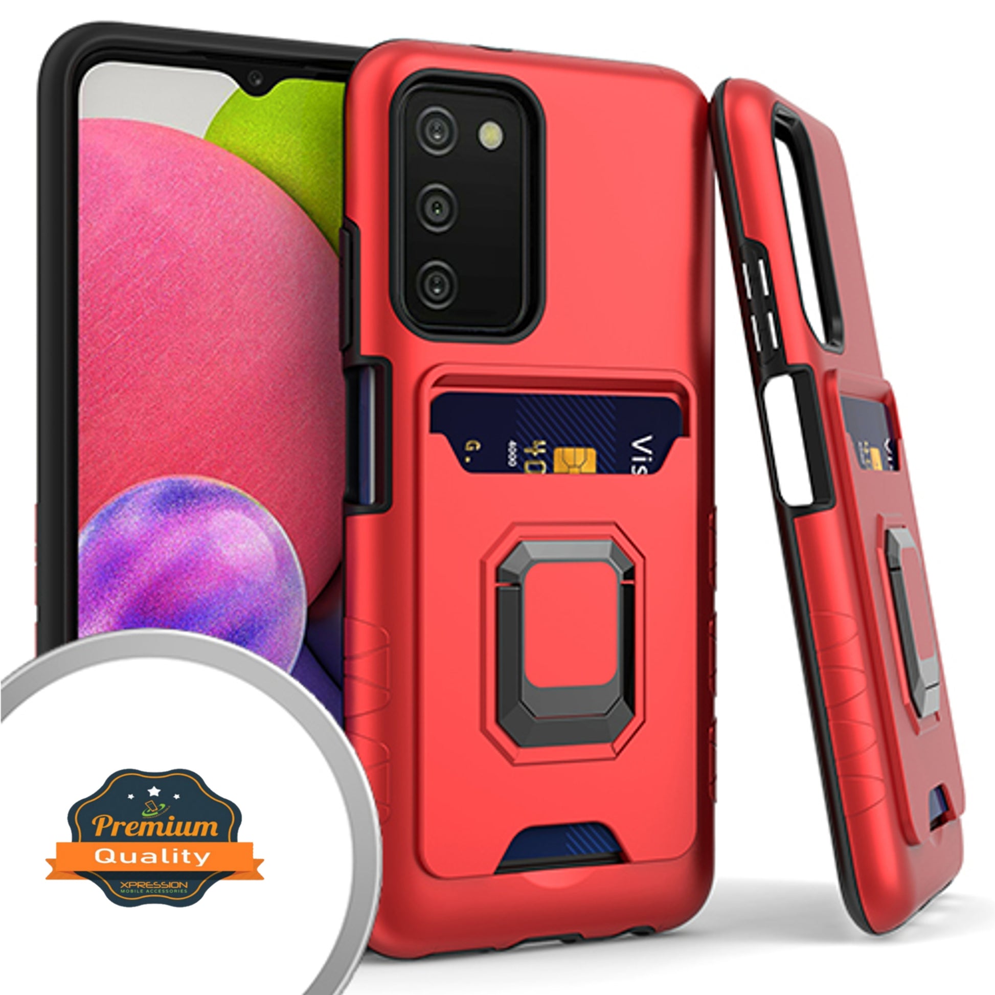 Samsung Galaxy A03s (2022) Wallet Credit Card Slot Holder with Metal Ring Kickstand Heavy Duty Shockproof Hybrid Dual Layer Magnetic Stand