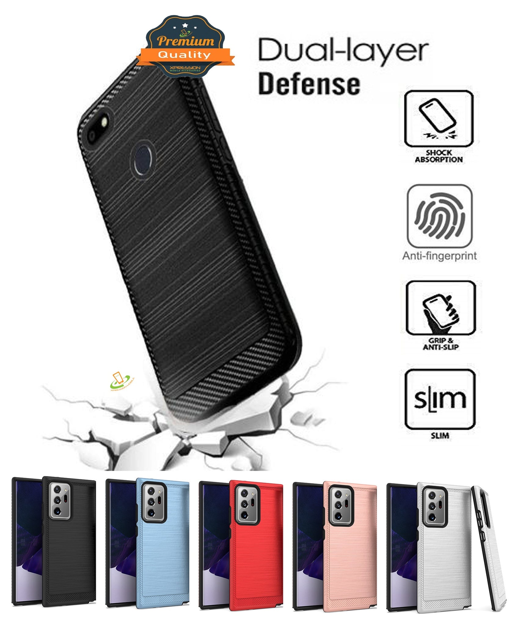 • Constructed of Brushed Metal Testure back panel layer and polycarbonate layer protects your device against impacts and bumps without damaging the device.