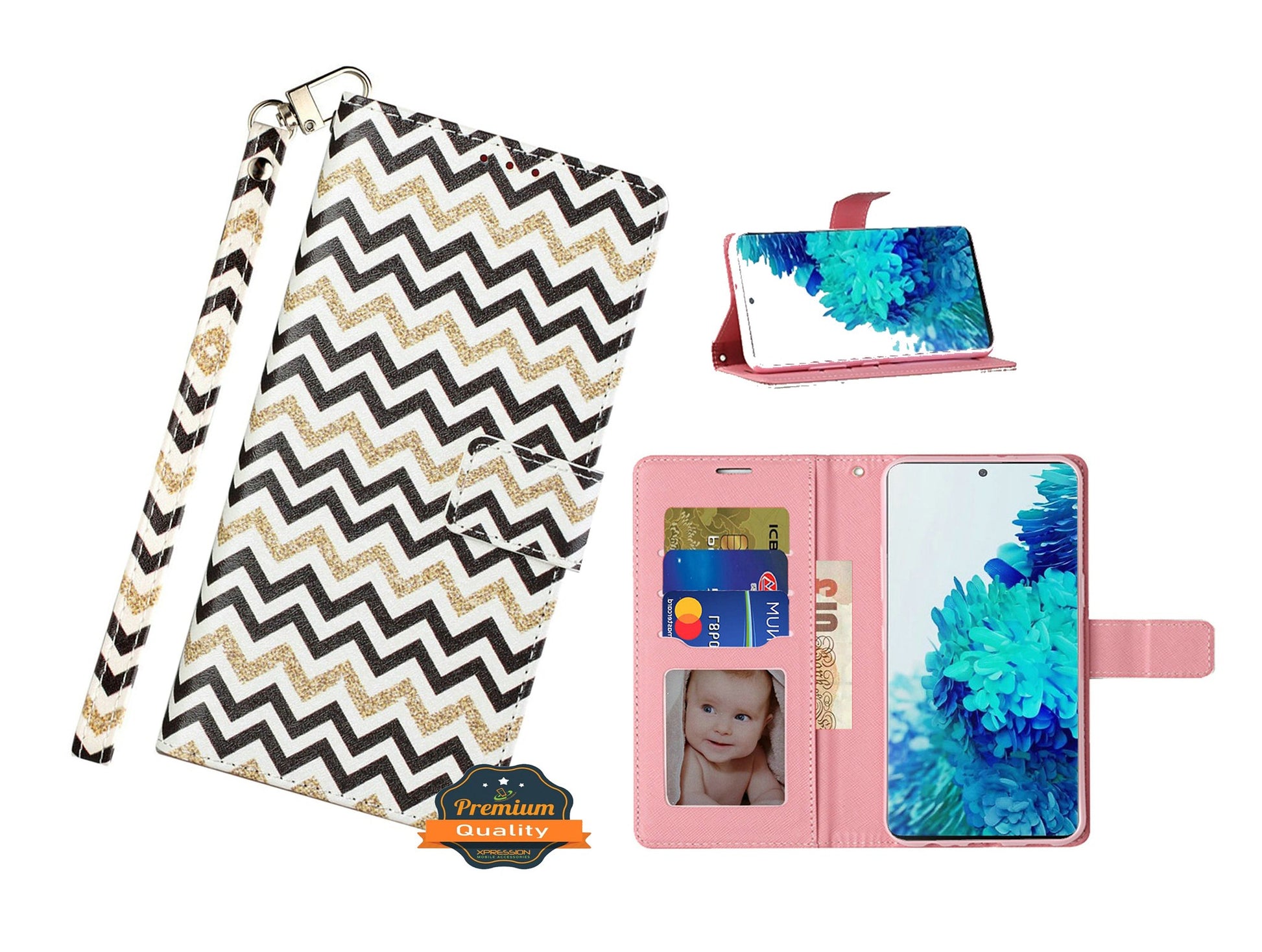 Fashion Pattern Design PU Leather Full Body Protective Pocket Wallet Case with Credit Card Holders, Wrist Strap, Magnetic Closure Card Storage Flip Cover.