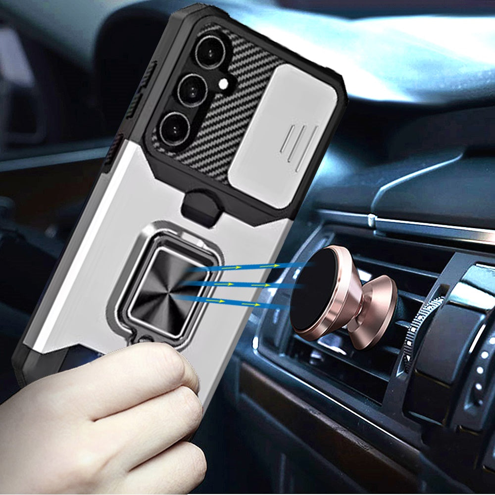 Silver Phone Case Cover For Samsung Galaxy A26 Premium Military Grade Drop Protection with Card Holder Slot and Camera Cover Slide, Heavy Duty Rugged Shockproof Phone Cover Built in Ring Stand Holder. Precise Cutouts & Sensitive Buttons Easily access buttons, speaker, camera, charging interface at the precise cutouts made from precision molding