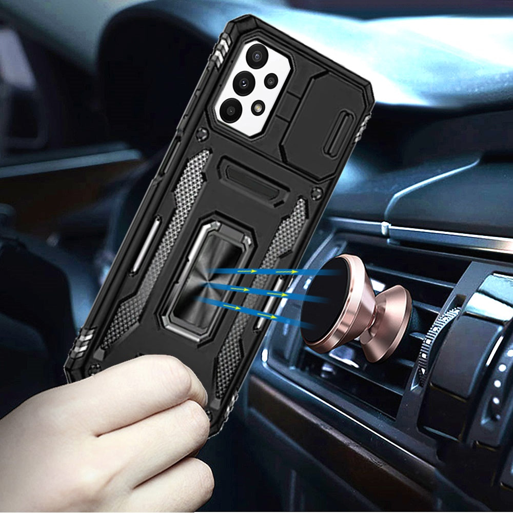 For Samsung Galaxy A32 5G Tough Hybrid Case with Movable Camera Window & Metal Ring Stand Shockproof Case Cover Black
