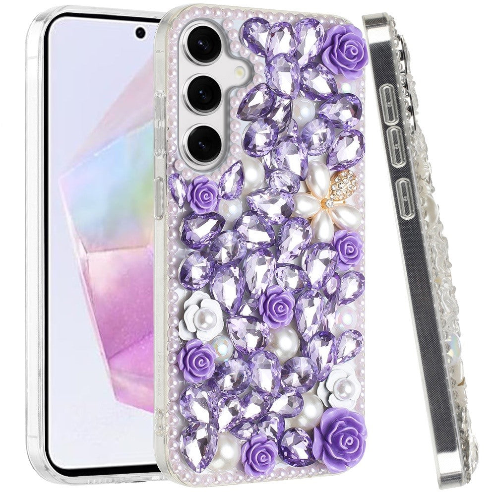 For Samsung Galaxy A36 Fashion Rose Flower Floral Bling Crystal 3D Full Diamonds Pearl Sparkle Rhinestone Glitter Hybrid Case Cover
