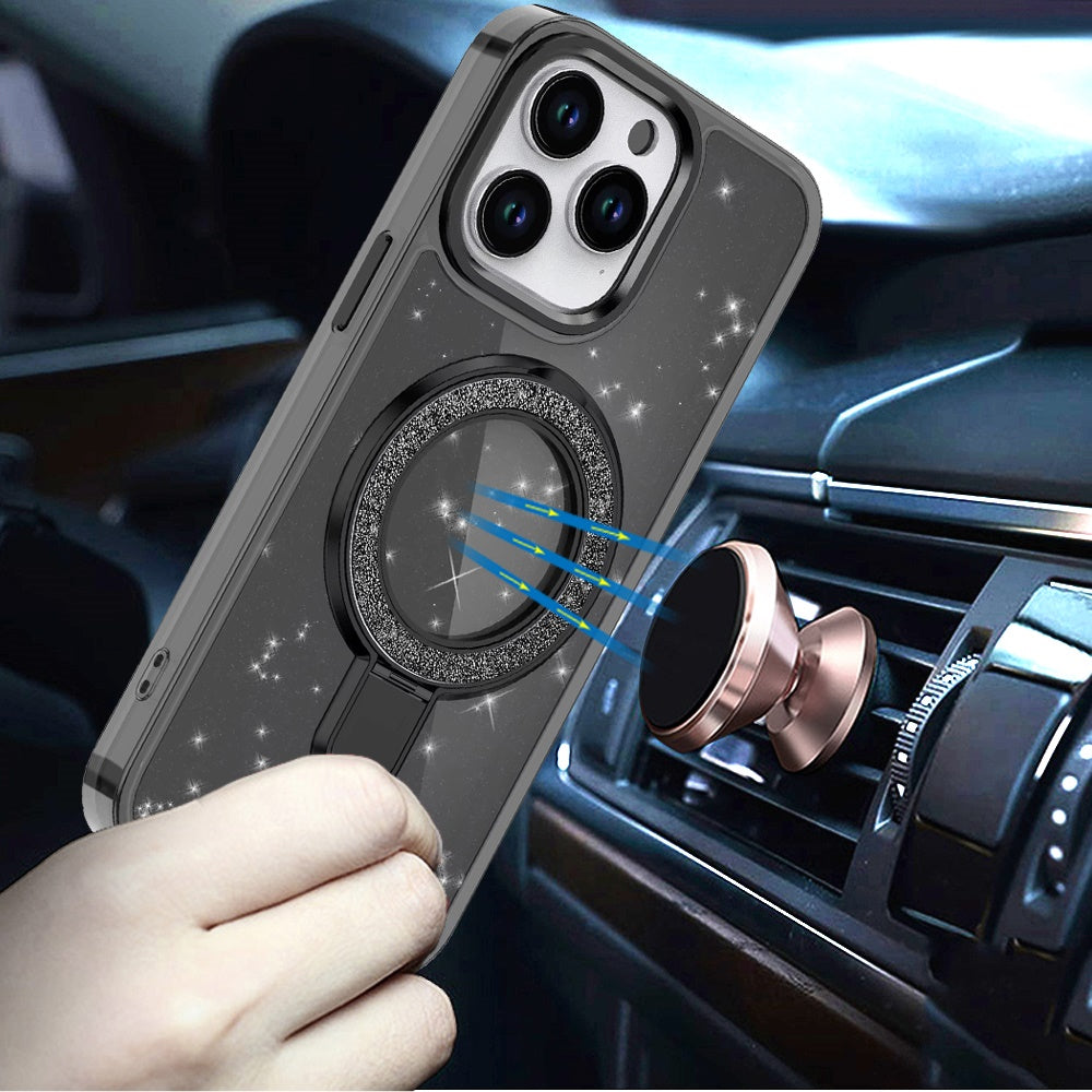 • Compatible for Samsung Galaxy S25 Ultra, Transparent glitter design adds sparkle without hiding phone color, Built-in rotating magnetic ring stand for easy hands-free viewing, Magnetic ring compatible with magnetic car mounts for convenience, Built-in magnetic circle compatible with MagSafe accessories, Shock-absorbing hybrid construction protects against drops and bumps, Precise cutouts ensure easy access to all ports and buttons, Slim profile maintains lightweight feel while offering strong protection,