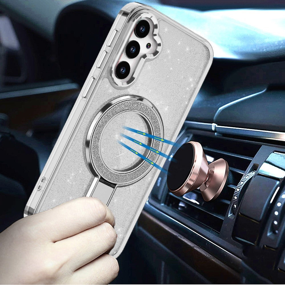 • Compatible for Samsung Galaxy S26, Transparent glitter design adds sparkle without hiding phone color, Built-in rotating magnetic ring stand for easy hands-free viewing, Magnetic ring compatible with magnetic car mounts for convenience, Built-in magnetic circle compatible with MagSafe accessories, Shock-absorbing hybrid construction protects against drops and bumps, Precise cutouts ensure easy access to all ports and buttons, Slim profile maintains lightweight feel while offering strong protection,