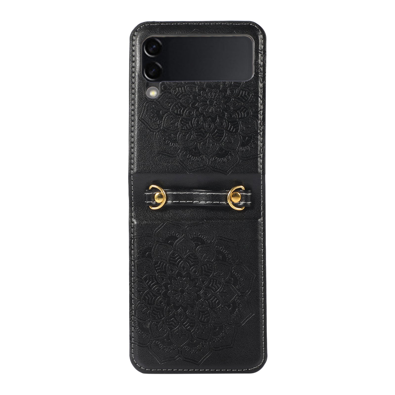 For Samsung Galaxy Z Flip 3 5G Embossed Floral Henna Mandala Design PU Leather with Strap Lanyard Slim Fit Hybrid Phone Case Cover