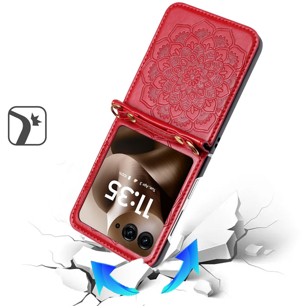 For Samsung Galaxy Z Flip 7 FE Embossed Floral PU Leather Henna Mandala Design Flip Cover with Strap, Hybrid Protective Case Cover Red