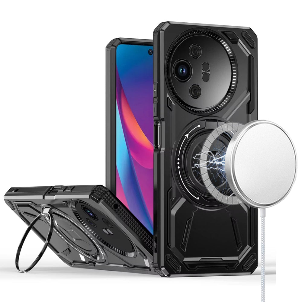 • Compatible for TCL 50 XL 5G, MagSafe compatibility for seamless wireless charging; Built-in magnetic ring ensures secure attachment to MagSafe chargers, 360° rotational kickstand for versatile hands-free viewing, Durable construction provides military-grade protection, Precise cutouts for easy access to all ports and buttons, Raised edges safeguard screen and camera from scratches, Non-slip grip design enhances handling comfort