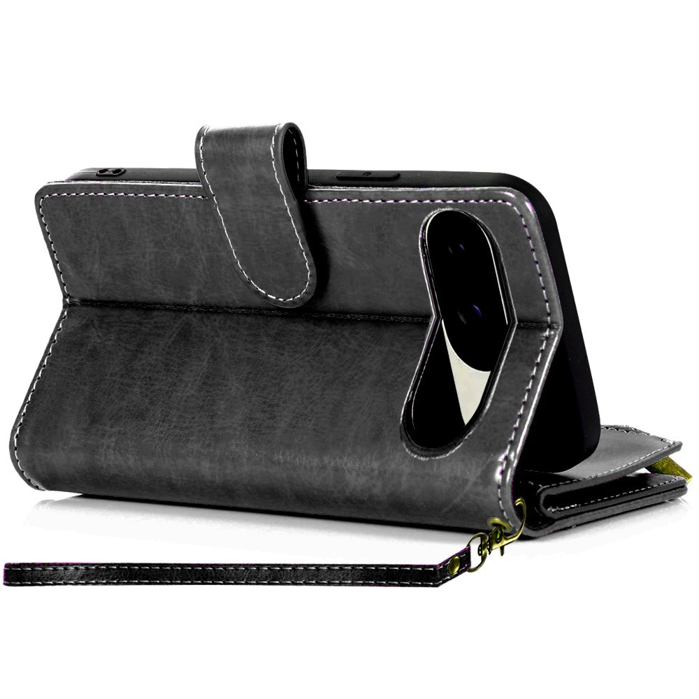Google Pixel 9 Pro XL (6.8") Leather Zipper Wallet Case 9 Credit Card Slots Cash Money Pocket Clutch Pouch Stand & Strap