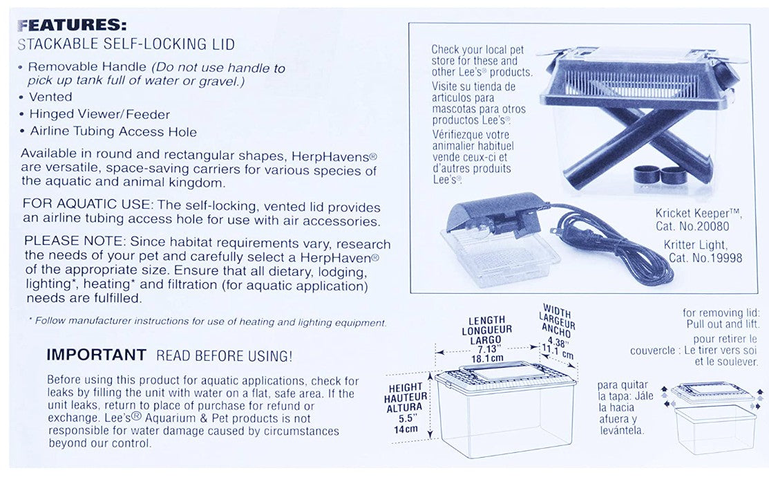 Lees Rectangular HerpHavens have self-locking lids with hinged viewer/feeders, attachment holes, and airline tubing holes.