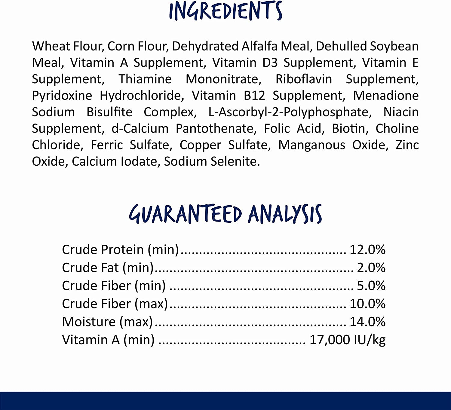 Ingredients: Wheat Flour, Corn Flour, Dehydrated Alfalfa Meal, Dehulled Soybean Meal, Vitamin A Supplement, Vitamin D3 Supplement, Vitamin E Supplement, Thiamine Mononitrate, Riboflavin Supplement, Pyridoxine Hydrochloride, Vitamin B12 Supplement, Menadione Sodium Bisulfite Complex, l-Ascorbyl-2-Polyphosphate, Niacin Supplement, d-Calcium Pantothenate, Folic Acid, Biotin, Choline Chloride, Ferric Sulfate, Copper Sulfate, Manganous Oxide, Zinc Oxide, Calcium Iodate, Sodium Selenite.