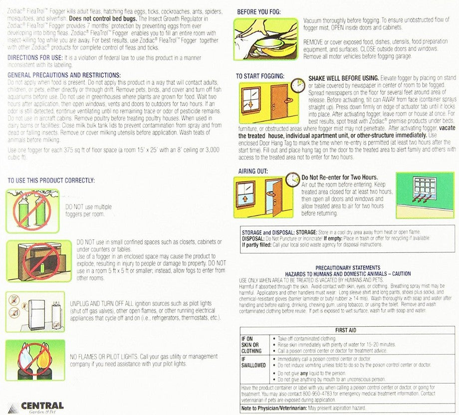 The Zodiac Flea and Tick Fogger value pack features a fast-acting, dual-action formula that provides the quickest, easiest, and most economical way to treat and protect the indoor environment.